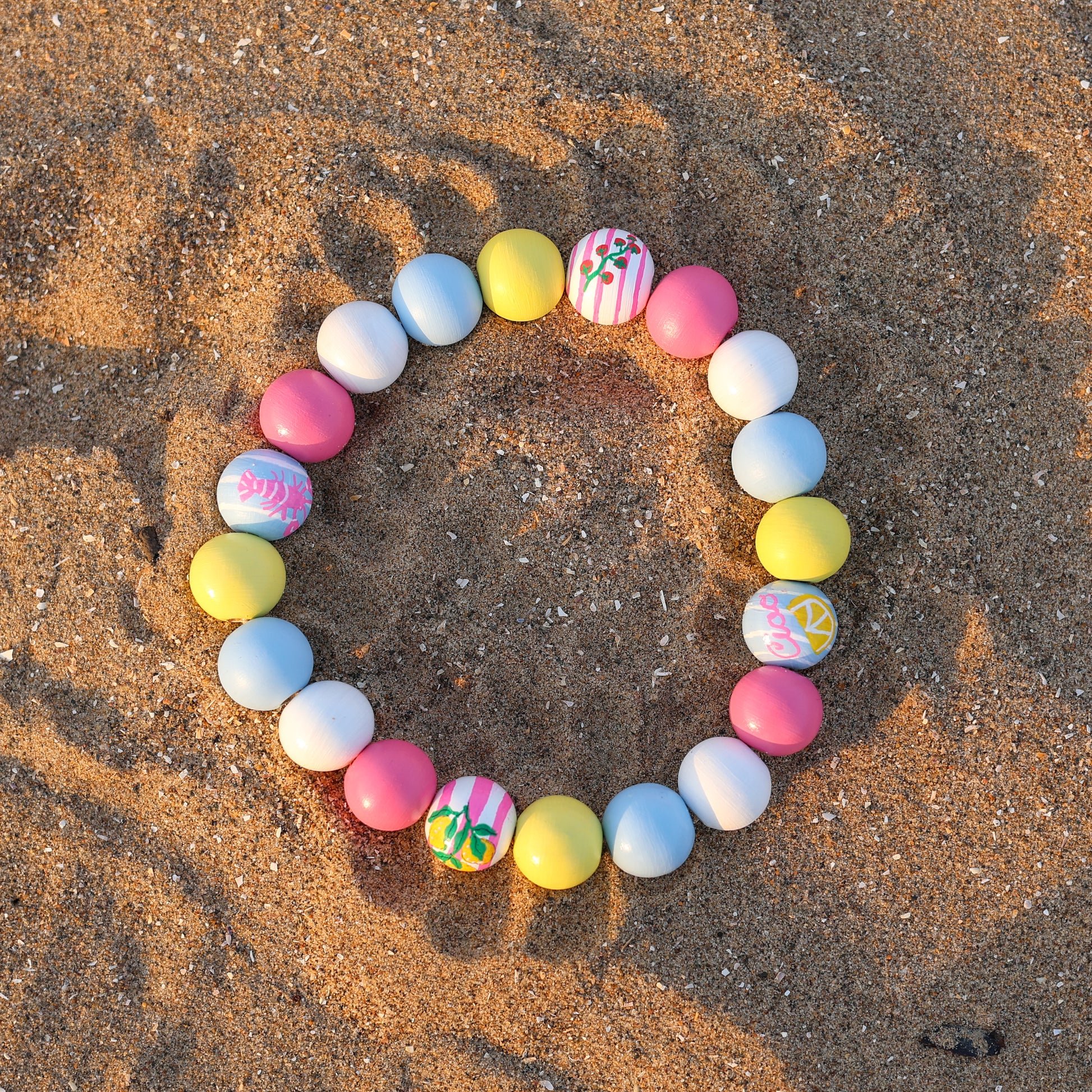 Featuring hand painted white, baby blue, yellow and pink plain beads.. with hand painted stripes and art work that consists of lemons, a lobster and tomatoes.