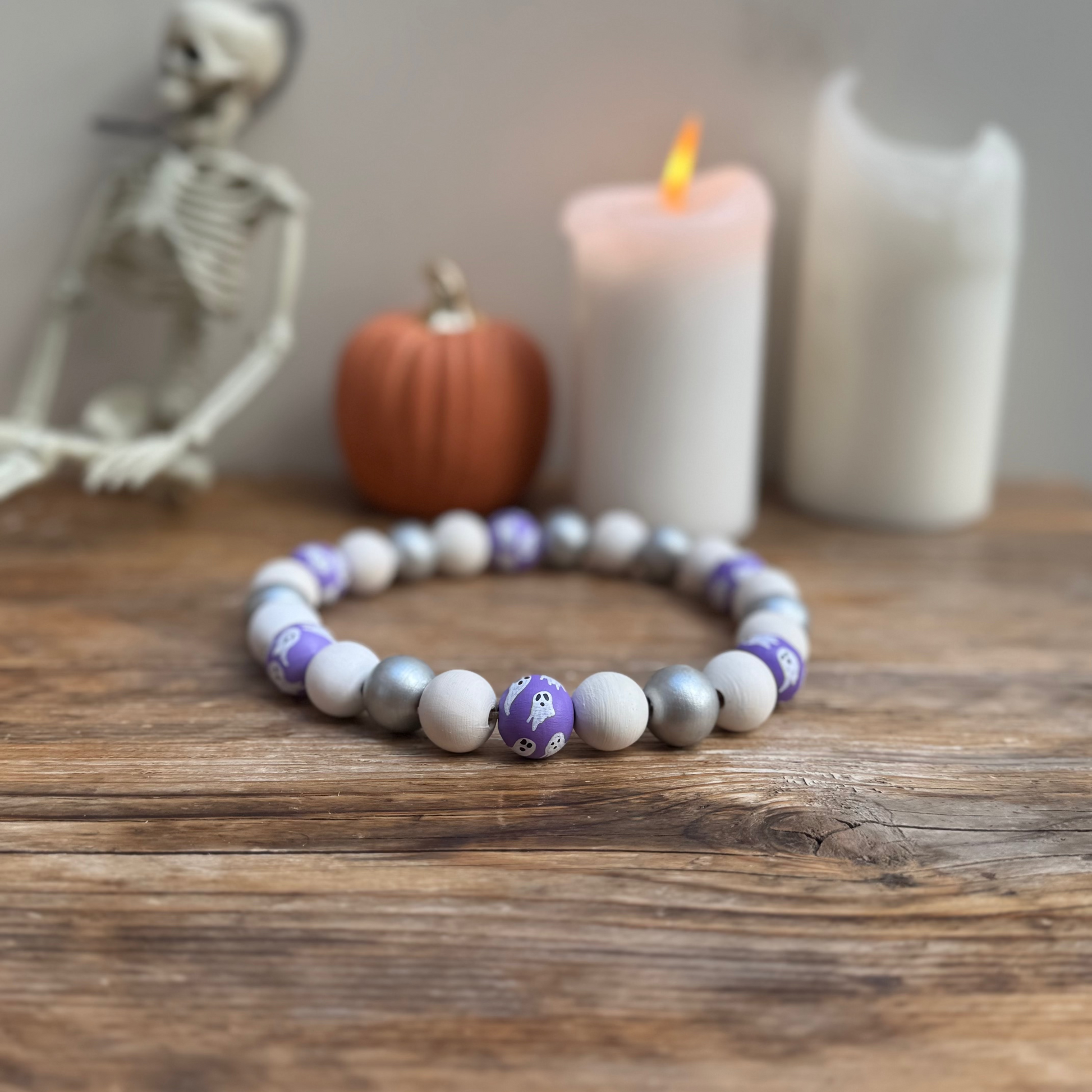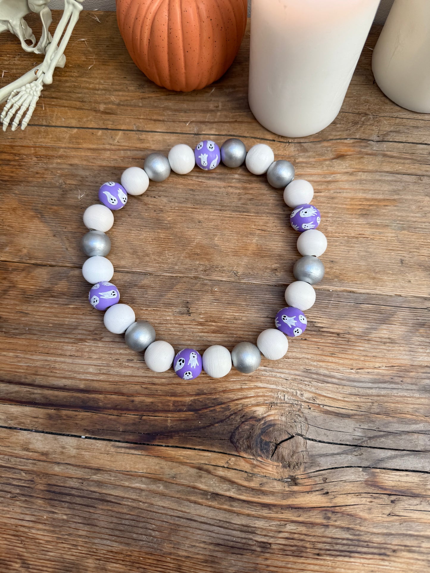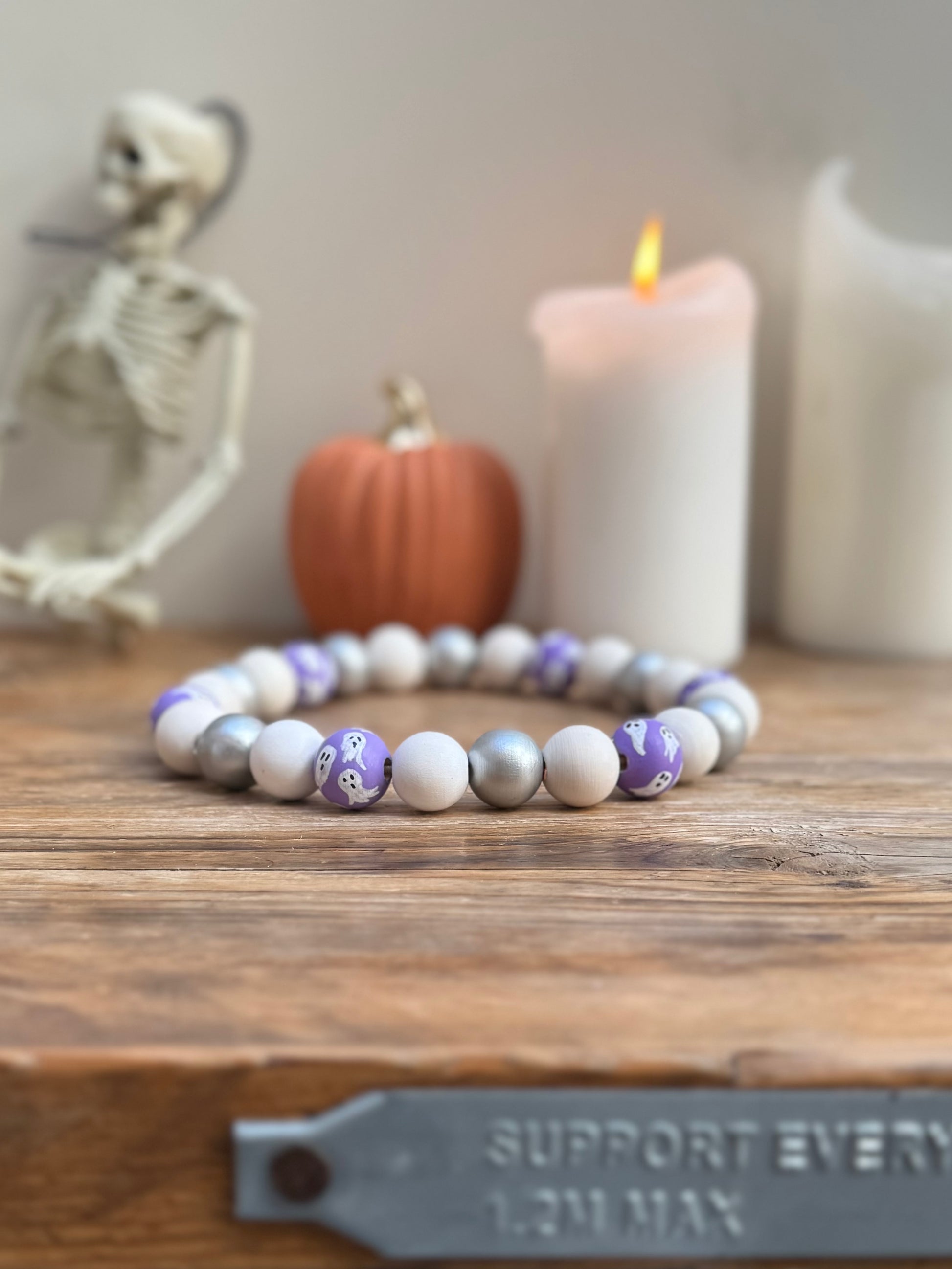 Featuring hand painted white and silver beads with pastel purple beads and little ghosts painted on top.