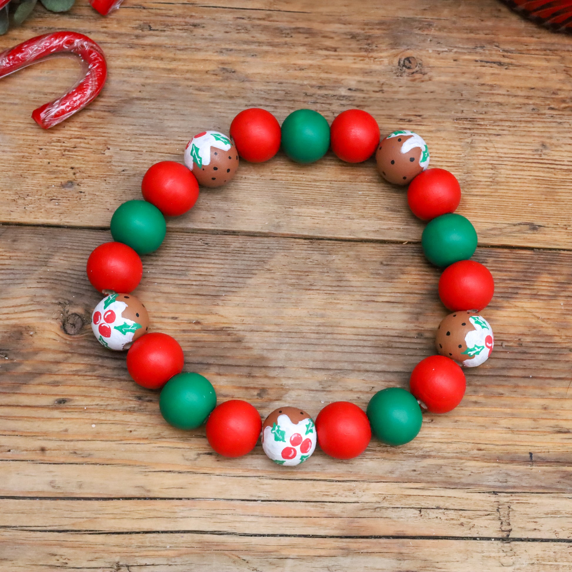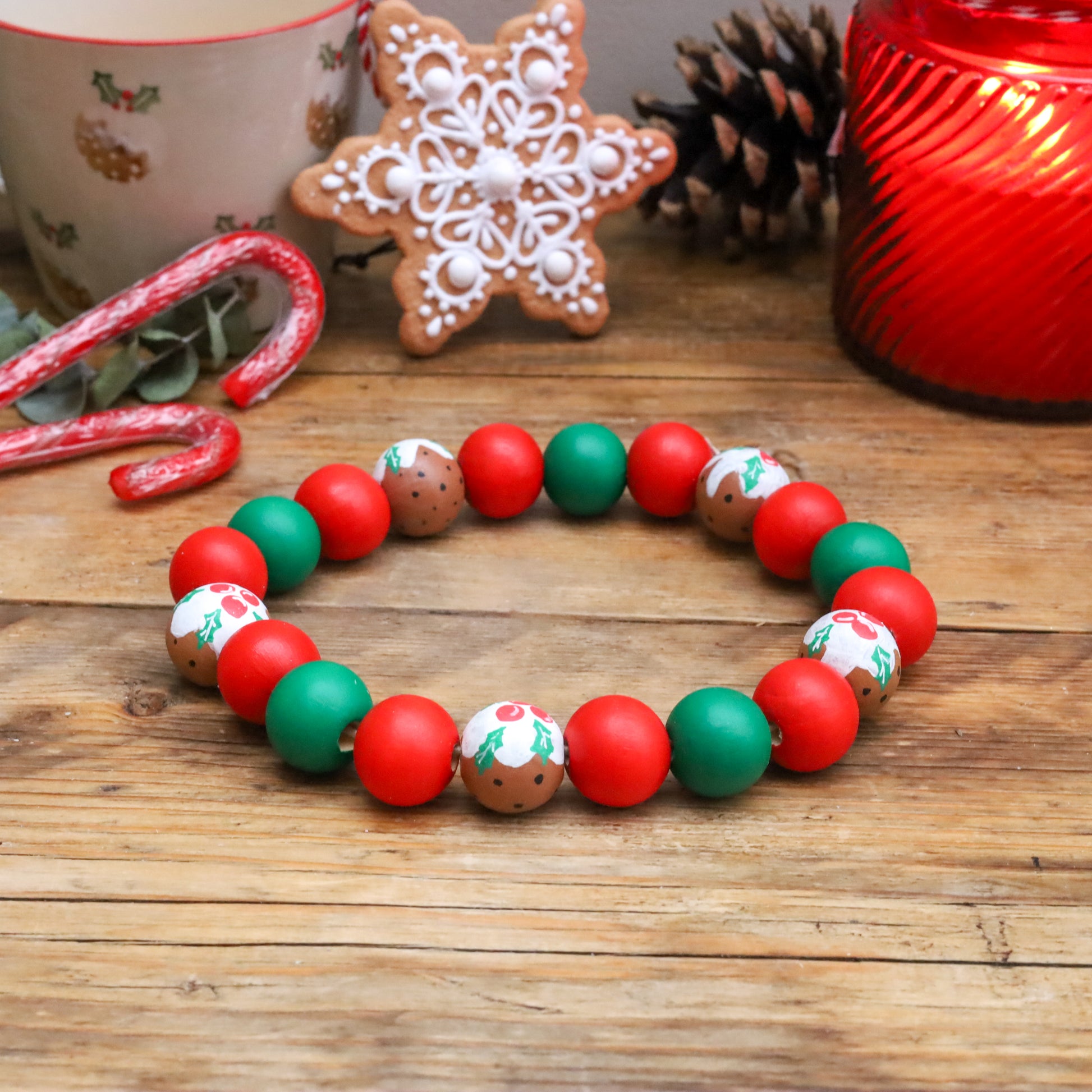Featuring hand painted red and green beads with hand painted Christmas puddings