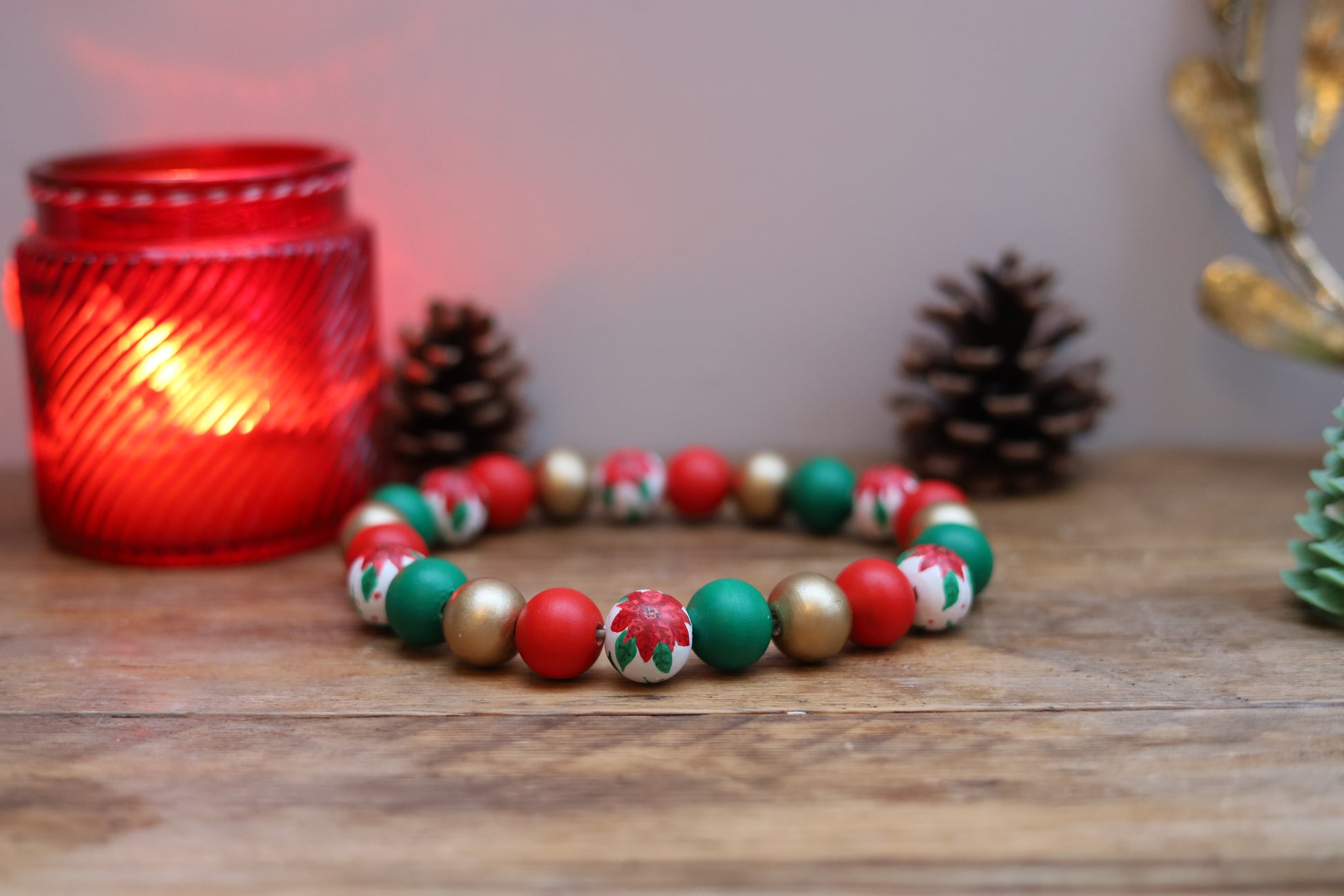 Featuring hand painted red, gold and green beads with hand painted poinsettias.