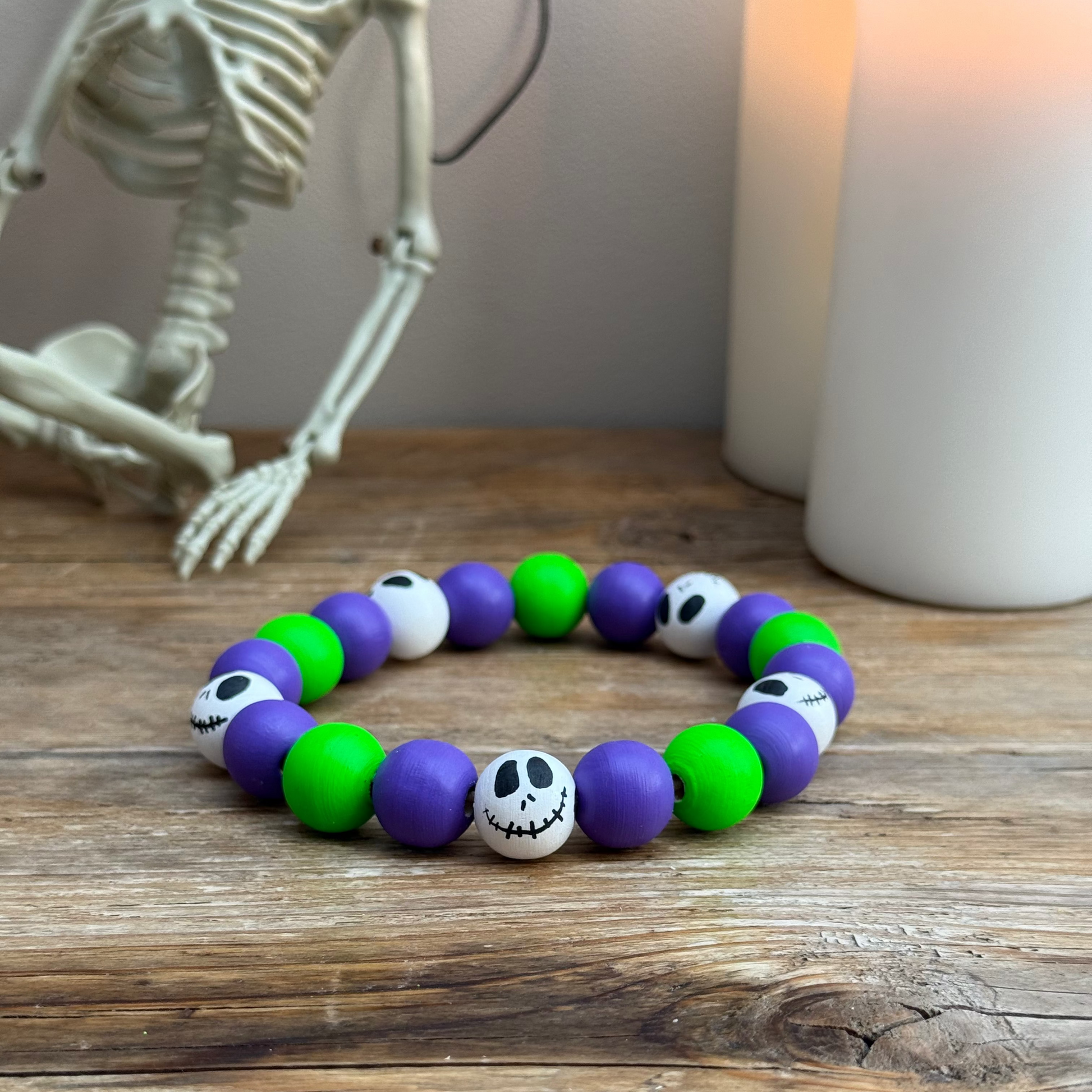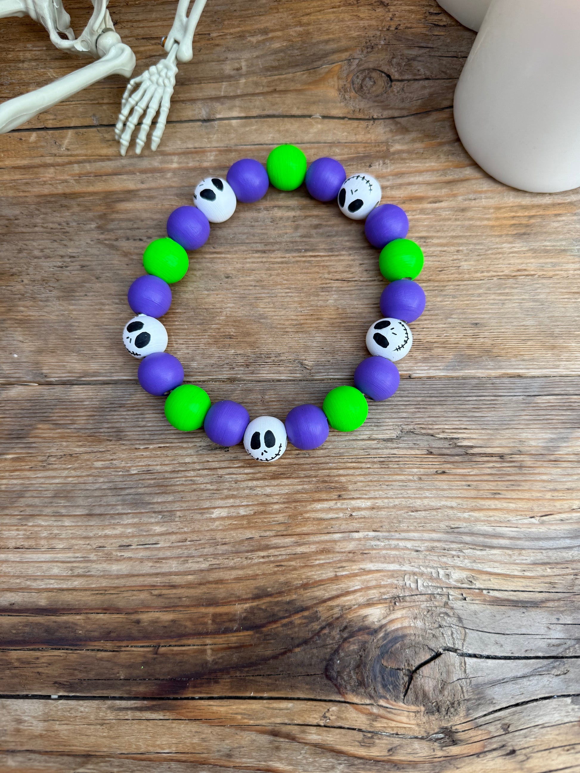 Featuring hand painted purple and fluorescent green beads with white beads and jack skellington faces on top