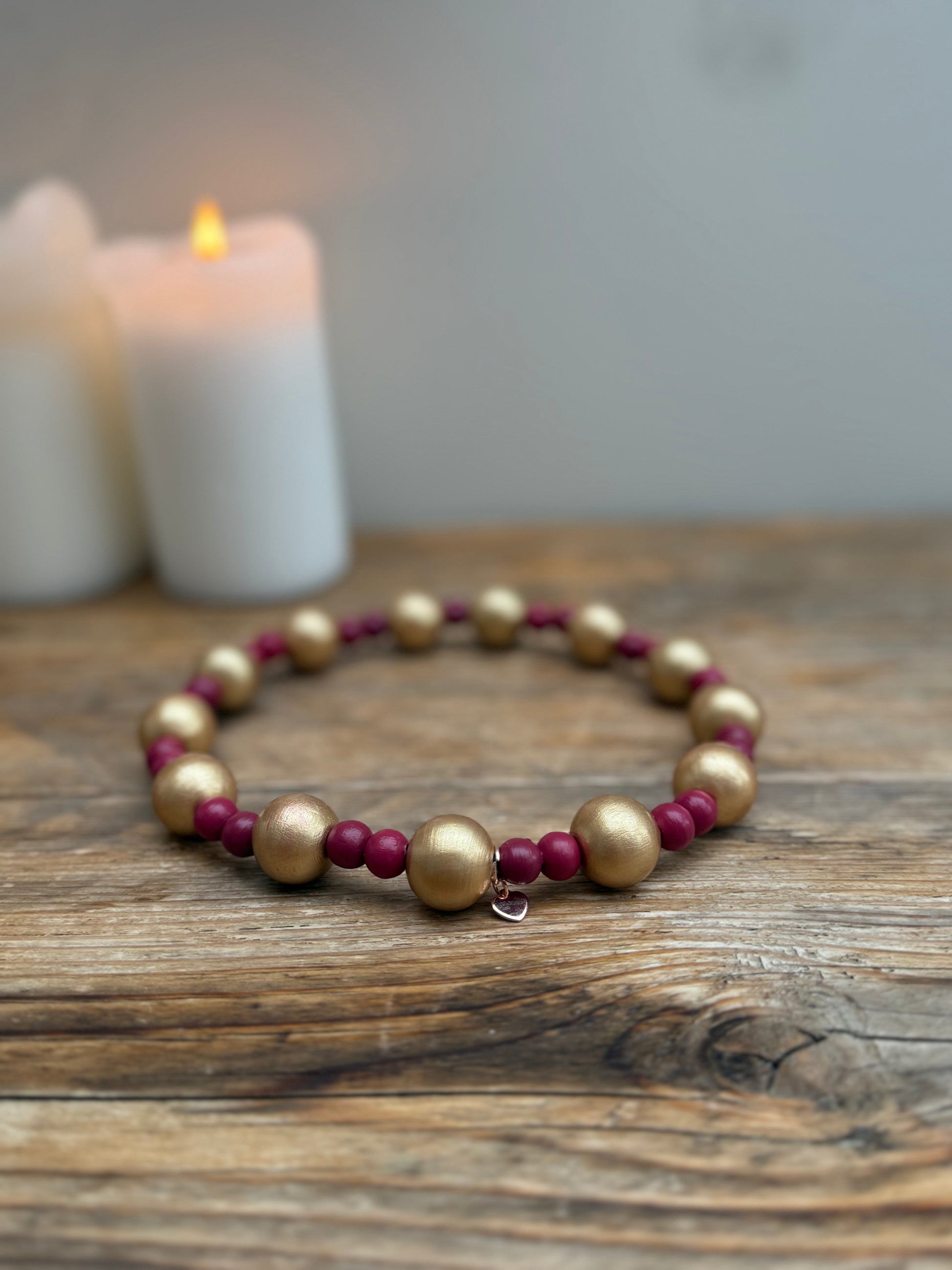 Featuring hand painted 20mm and 10mm beads using a hand created gold colour that features gold leaf, and wine coloured beads.