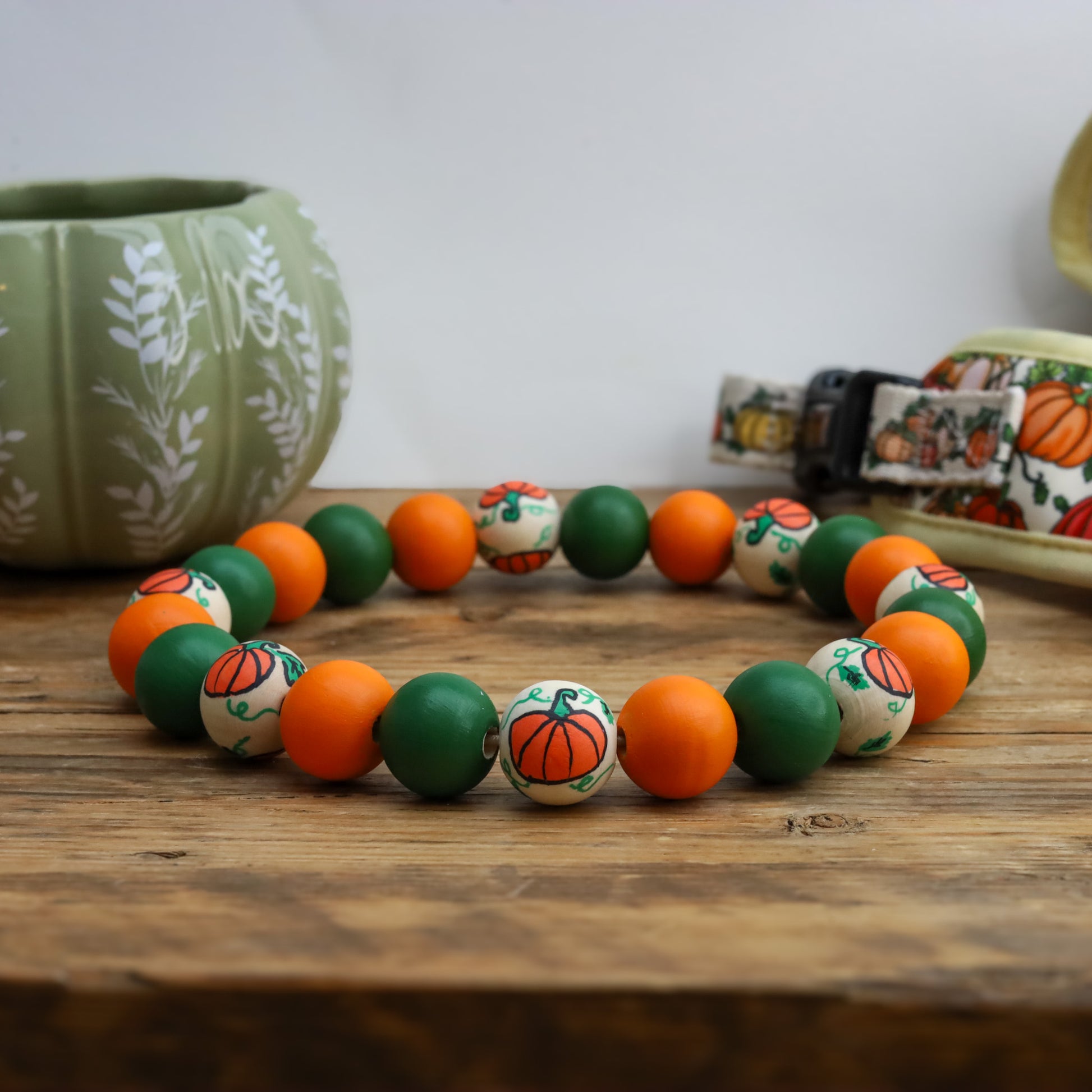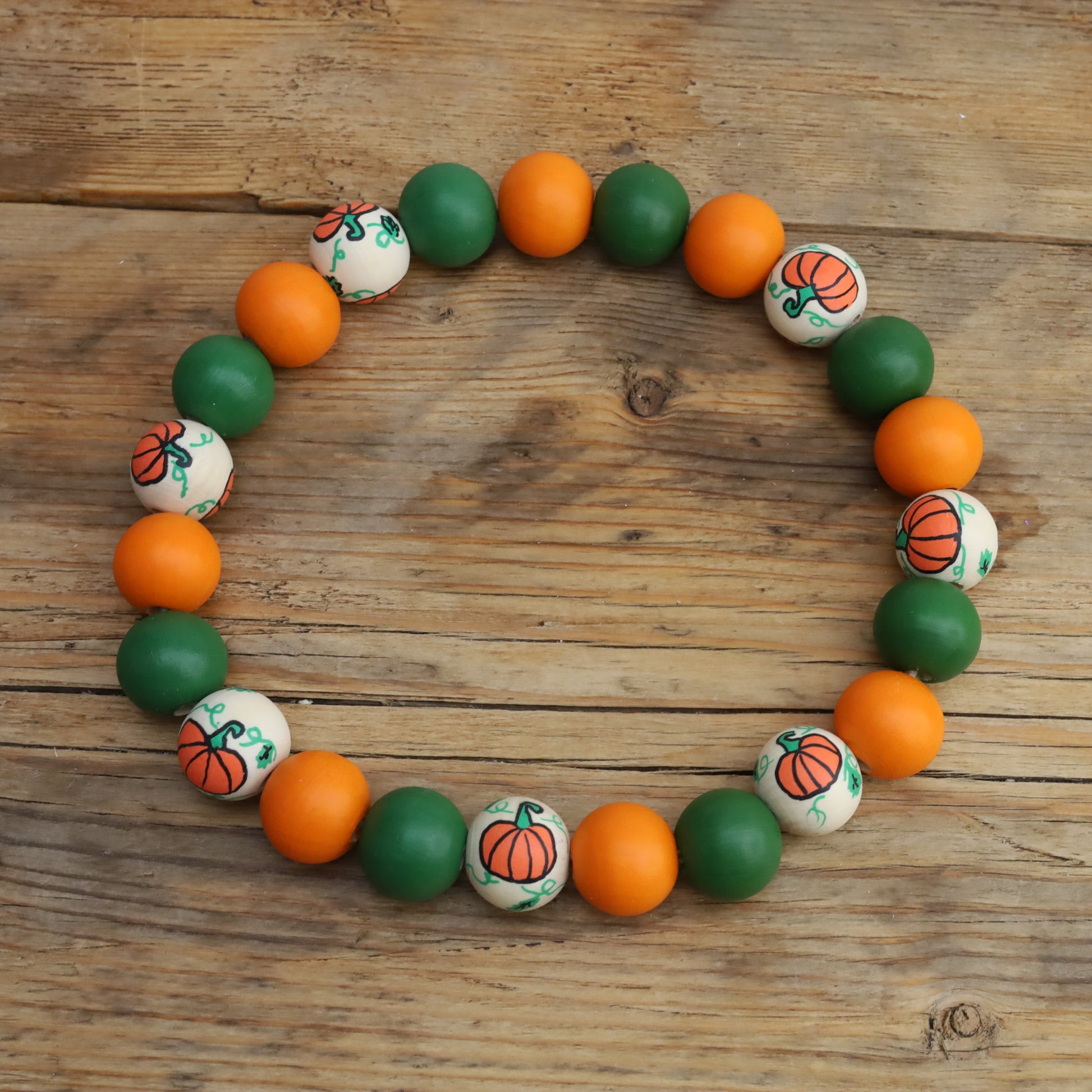 Featuring hand painted shades of green and orange beads with hand painted pumpkins.