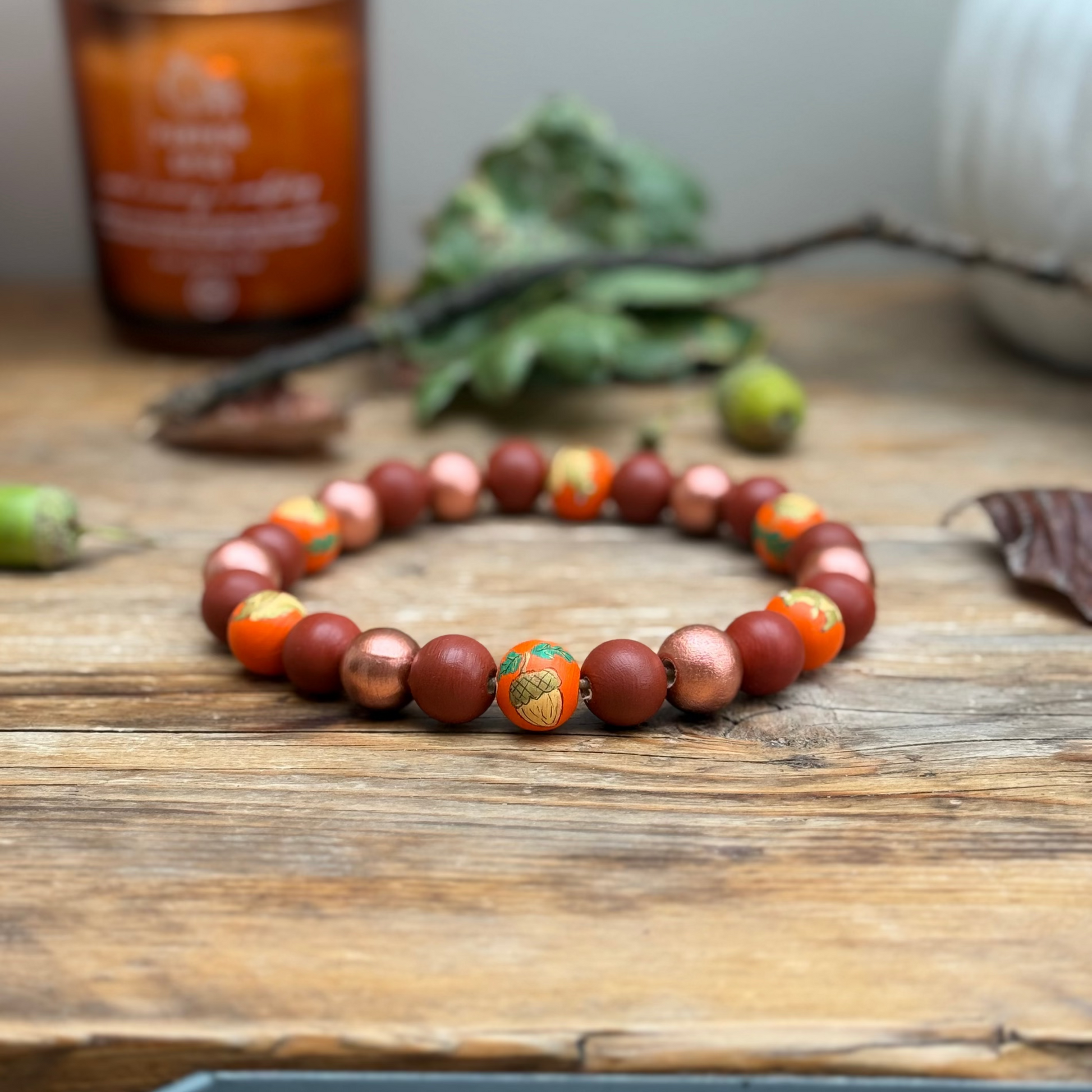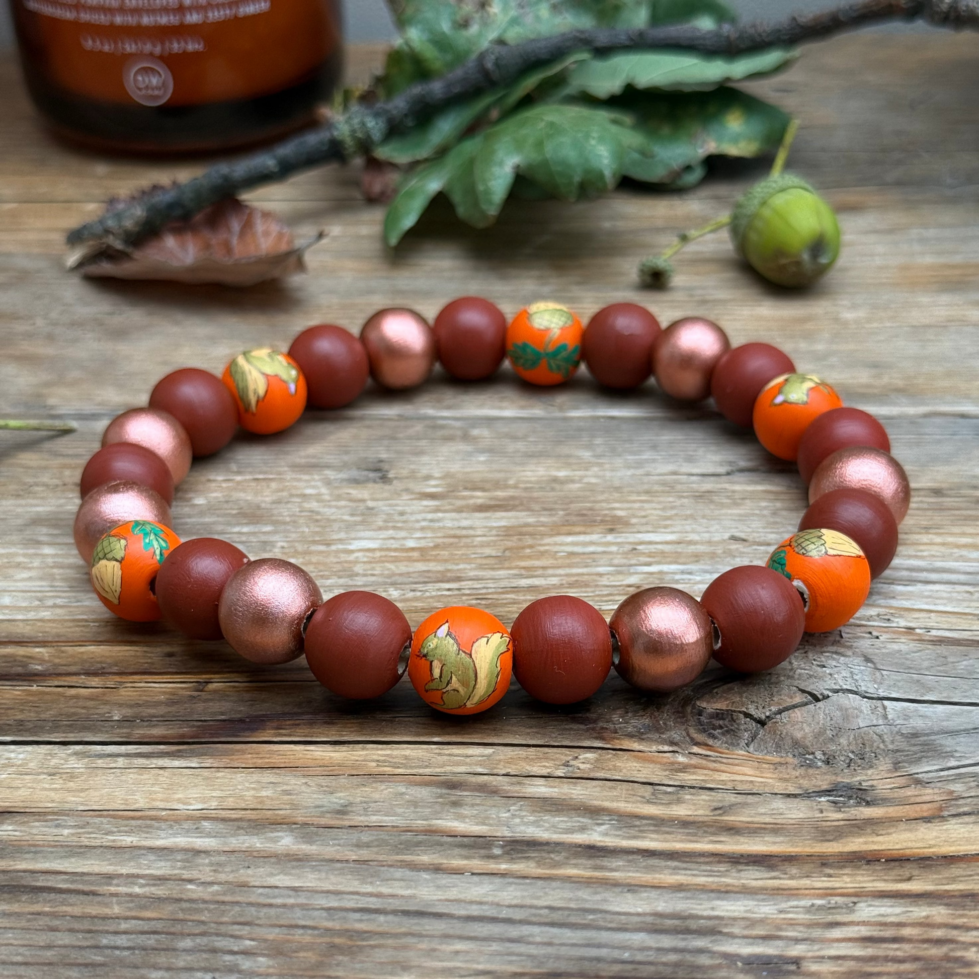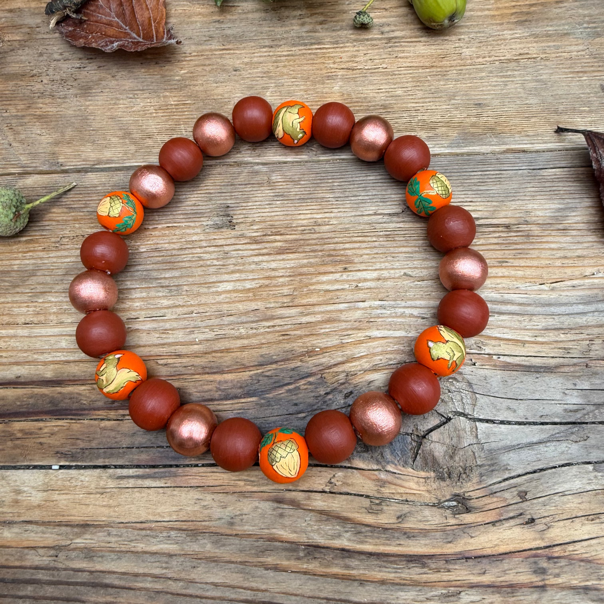Featuring hand painted red brown, copper and orange beads with hand painted acorns and squirrels.
