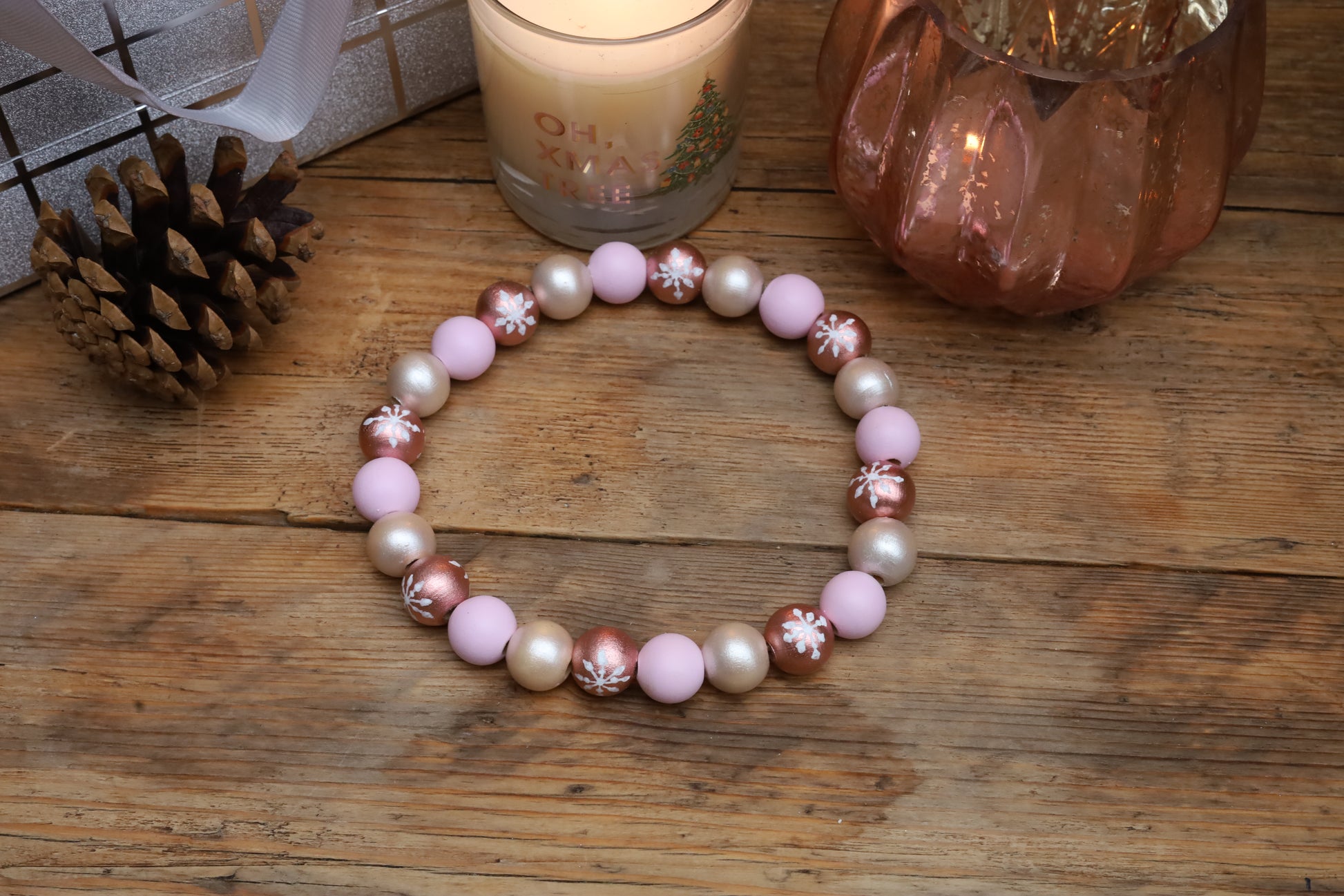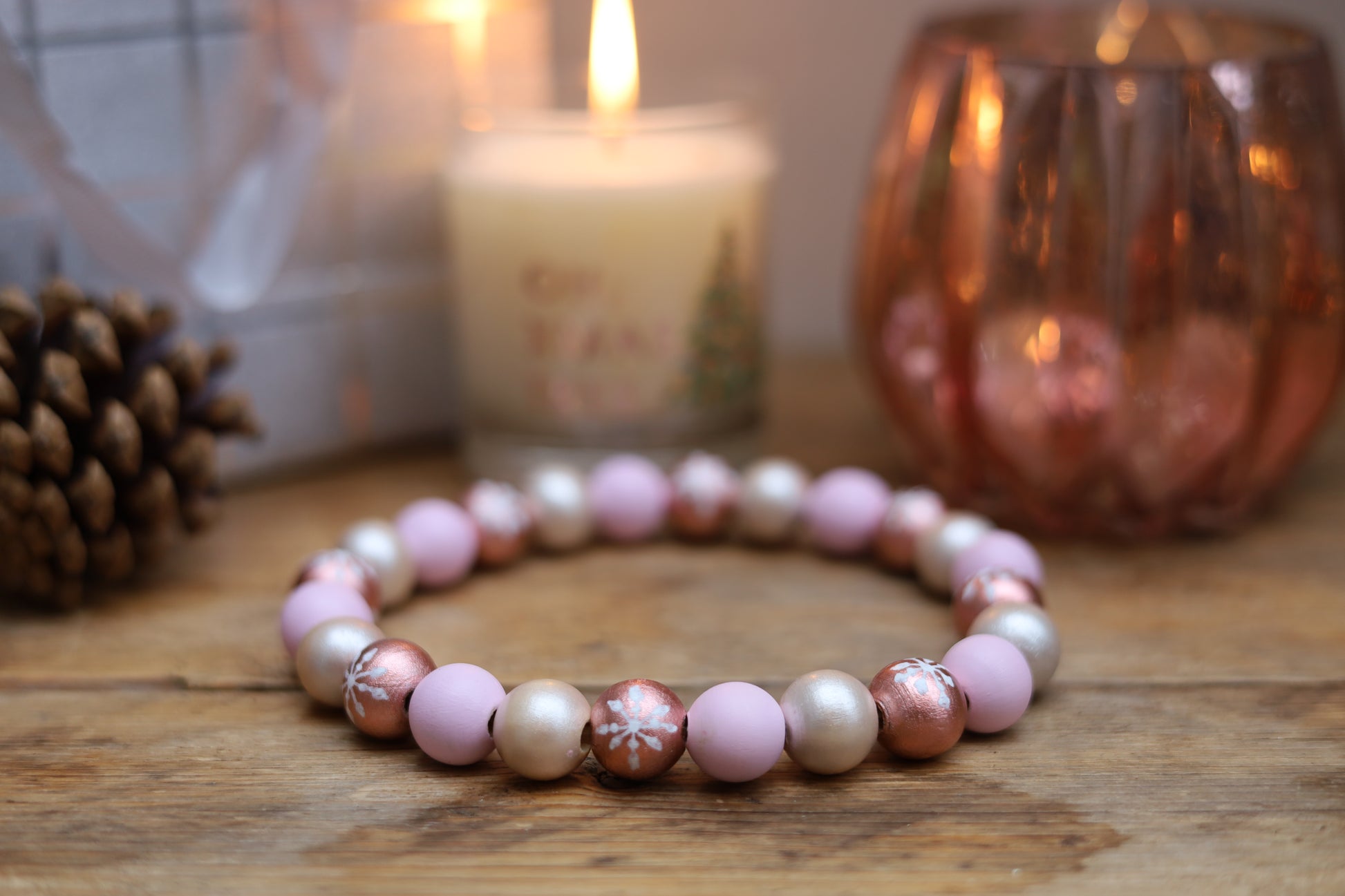 Featuring hand painted baby pink, pearl & rose gold with white snowflakes