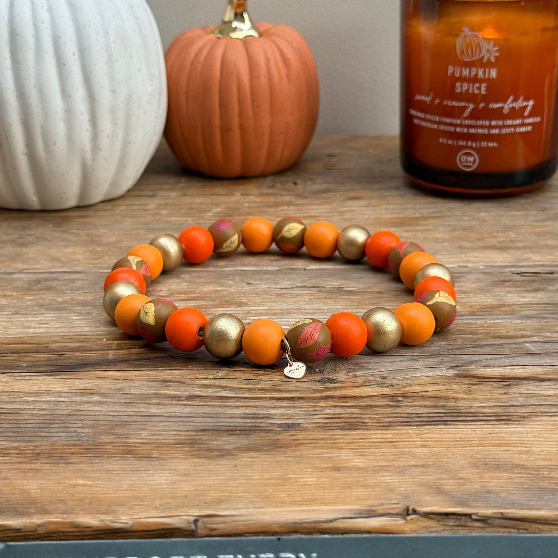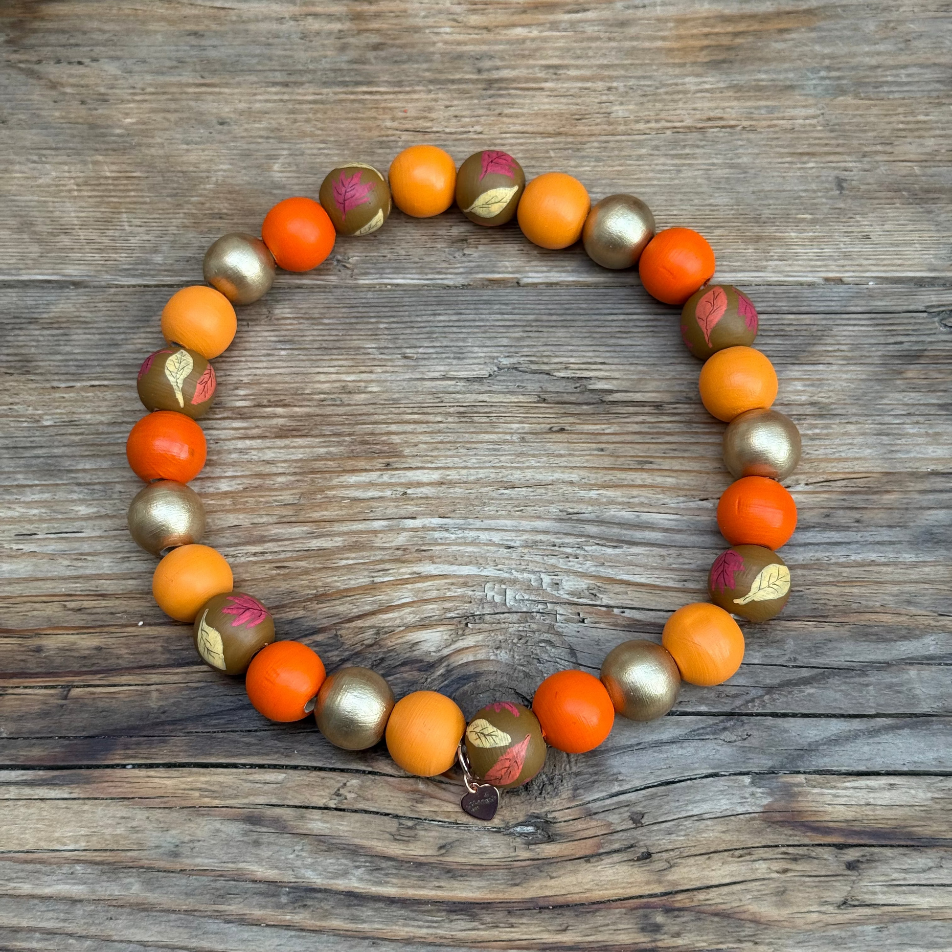 Featuring hand painted burnt orange, gold, light orange, pearl and brown beads with leaves painted on top.